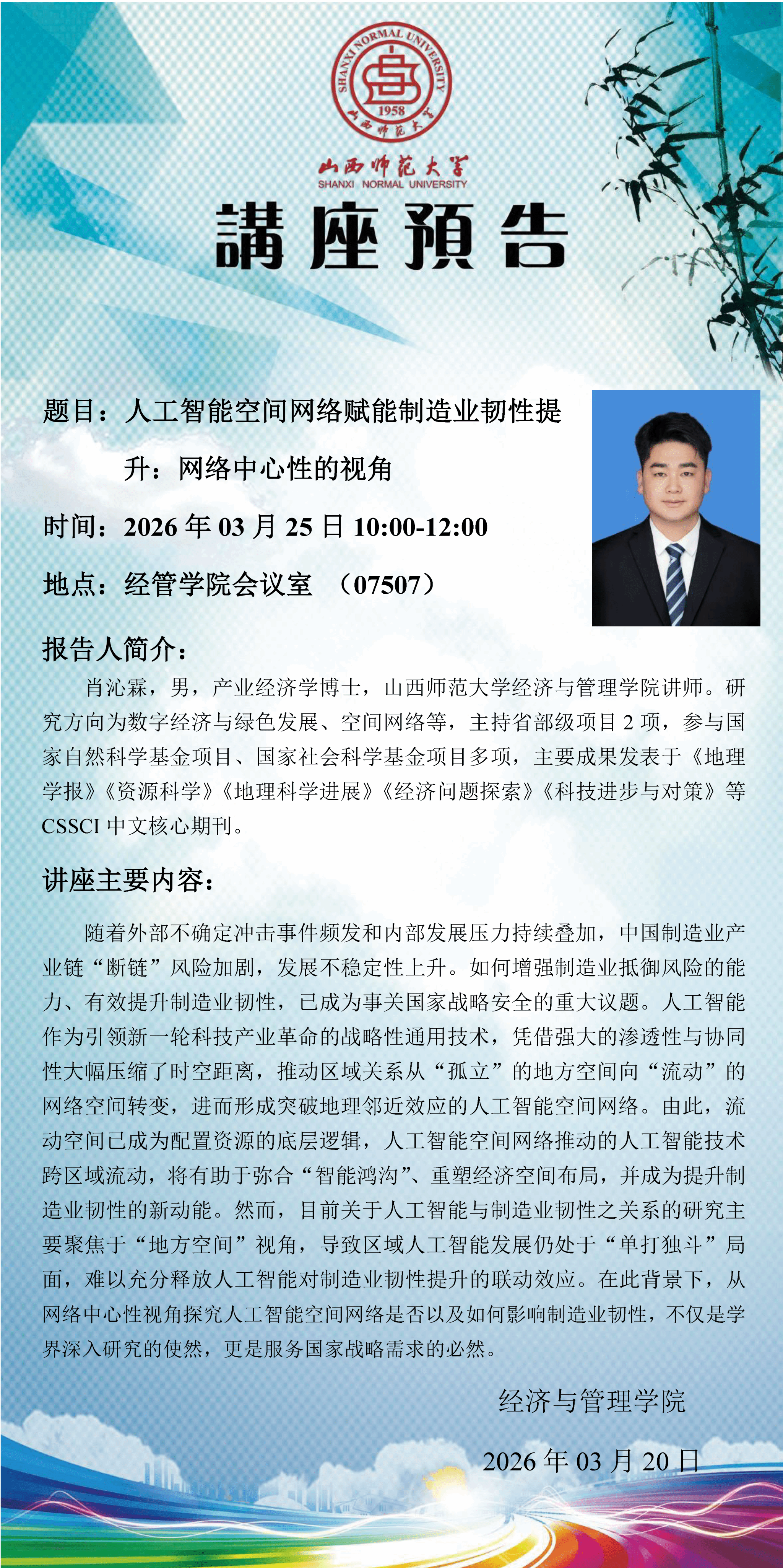 讲座预告-人工智能空间网络赋能制造业人性提升:网络中心性的视角
