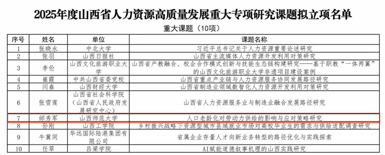 捷报频传,科研添彩!我院邰秀军老师申报的课题《人口老龄化对劳动力供给的影响与应对策略研究》成功入选2025年度山西省人力资源高质量发展重大专项研究拟立项名单,特此报喜!